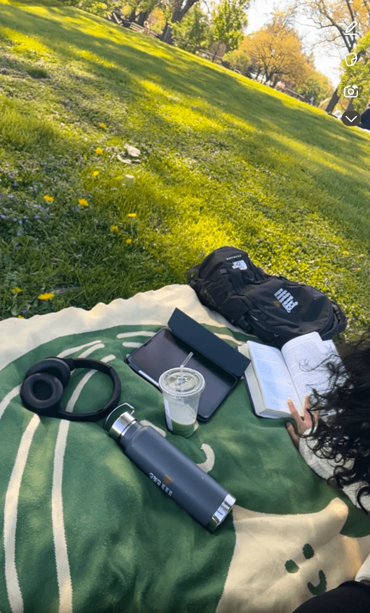 A picnic blanket, matcha in hand, lying on the grass with a book or ipad doing nothing and everything at once.