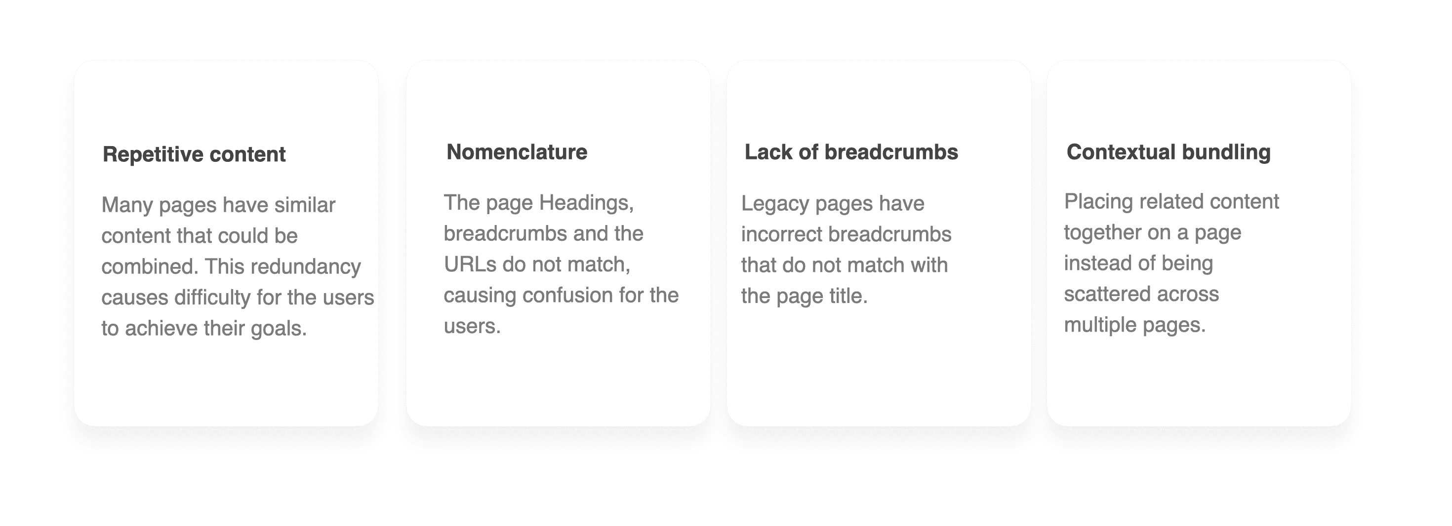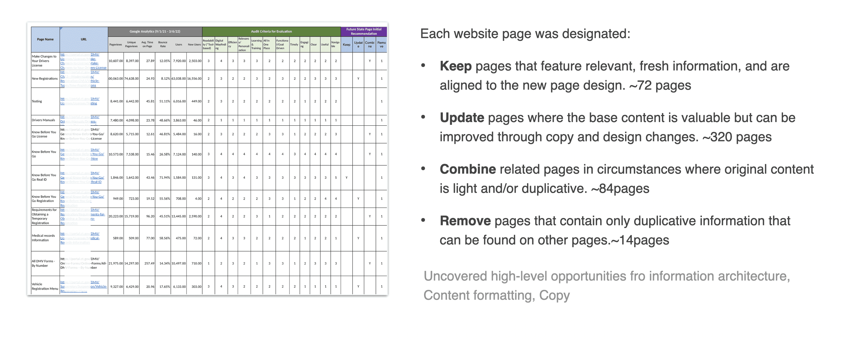 Reviewed over 490 pages, identified content gaps and redundancy, and used analytics and user archetypes to prioritize information flow.